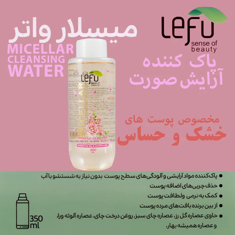 محلول پاک کننده آرایش میسلار واتر صورتی لفو حاوی عصاره گل رز ، روغن درخت چای ، عصاره آلوورا و عصاره همیشه بهار که باعث نرمی و طیف شدن هر چه بیشتر پوست شما میشود و همچنین باعث از بین بردن بافت های مرده پوست شما می شود .