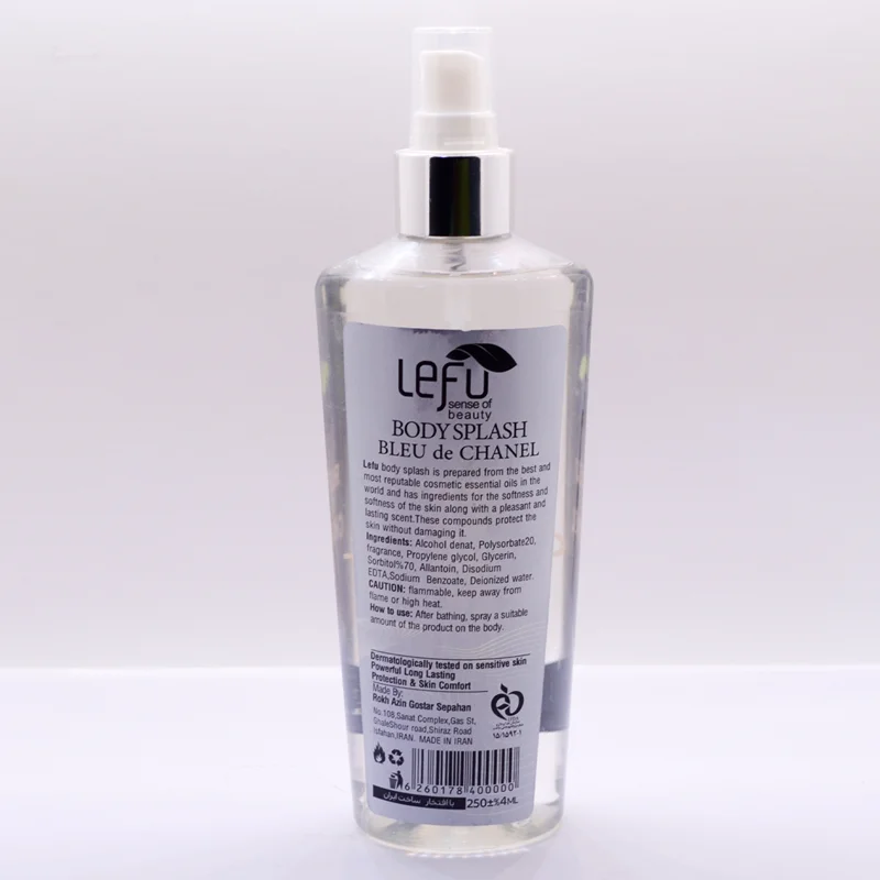 اسپری خوشبو کننده بدن لفو با رایحه BLEU DE CHANEL حاوی اسانس ادکلن اصلی با گرید بهداشتی تحت لیسانس شرکت اصلی در ایران تولید می شود که با داشتن عصاره آلورا و دکسپنتول باعث نرمی و شادابی پوست شما می گردد همچنین رایحه خوش این بادی اسپلش 24 ساعت بر روی بدون شما مانده و لکی بر لباس شما ایجاد نخواهد کرد.