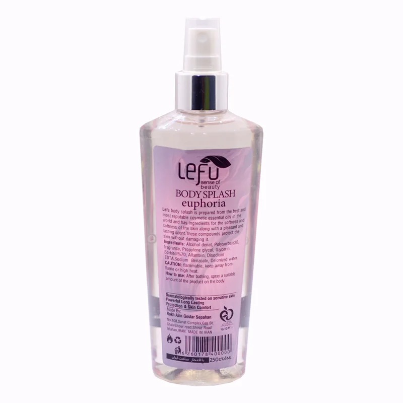 اسپری خوشبو کننده بدن لفو با رایحه EUPHORIA حاوی اسانس ادکلن اصلی با گرید بهداشتی تحت لیسانس شرکت اصلی در ایران تولید می شود که با داشتن عصاره آلورا و دکسپنتول باعث نرمی و شادابی پوست شما می گردد همچنین رایحه خوش این بادی اسپلش 24 ساعت بر روی بدون شما مانده و لکی بر لباس شما ایجاد نخواهد کرد.