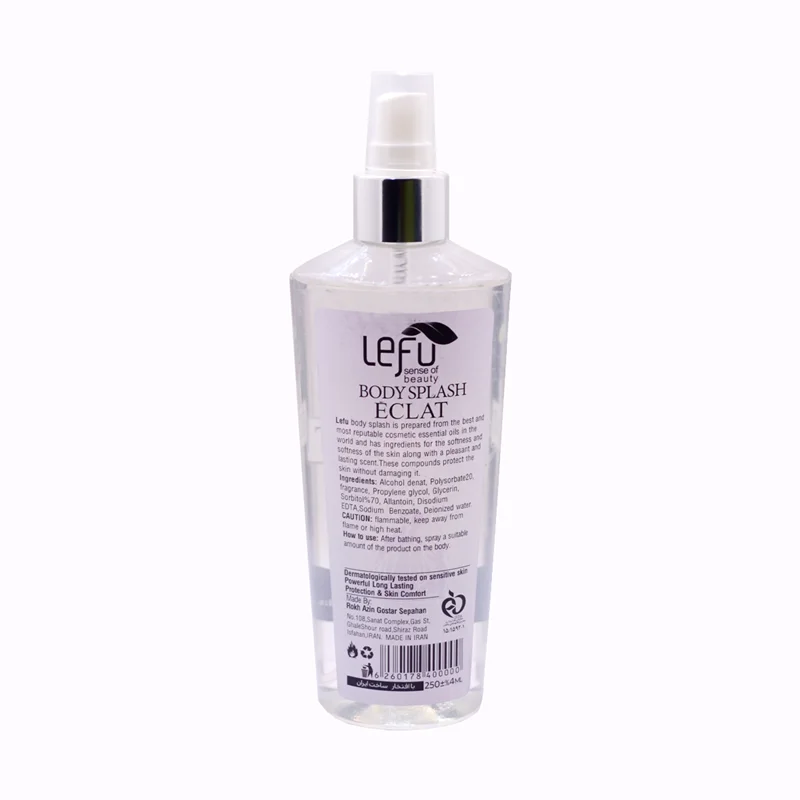 اسپری خوشبو کننده بدن لفو با رایحه ECLATE حاوی اسانس ادکلن اصلی با گرید بهداشتی تحت لیسانس شرکت اصلی در ایران تولید می شود که با داشتن عصاره آلورا و دکسپنتول باعث نرمی و شادابی پوست شما می گردد همچنین رایحه خوش این بادی اسپلش 24 ساعت بر روی بدون شما مانده و لکی بر لباس شما ایجاد نخواهد کرد.