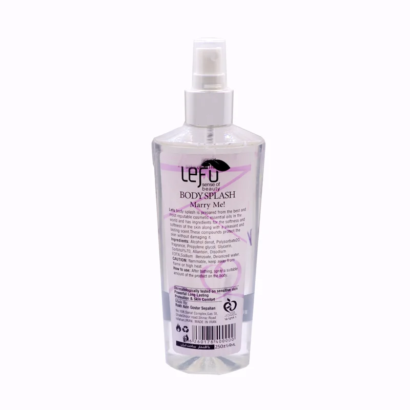 اسپری خوشبو کننده بدن لفو با رایحه MARRY ME حاوی اسانس ادکلن اصلی با گرید بهداشتی تحت لیسانس شرکت اصلی در ایران تولید می شود که با داشتن عصاره آلورا و دکسپنتول باعث نرمی و شادابی پوست شما می گردد همچنین رایحه خوش این بادی اسپلش 24 ساعت بر روی بدون شما مانده و لکی بر لباس شما ایجاد نخواهد کرد.