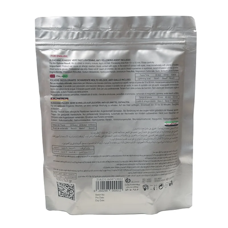 - پودر دکلره ای که در مدت زمان 35 دقیقه موها را به پایه ی 8 و 9 بلوند میرساند.