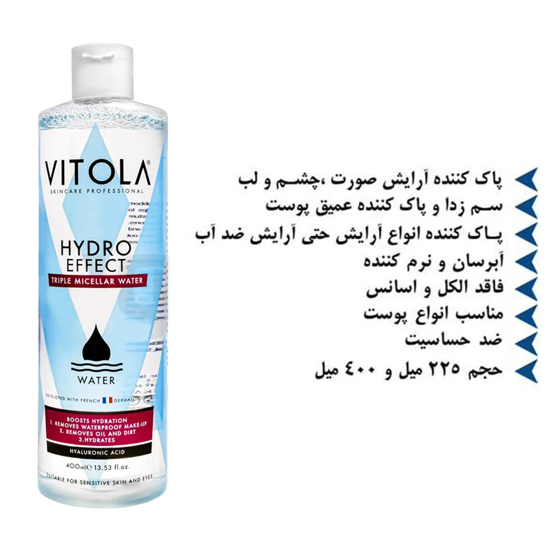 میسلار واتر هيدرو افکت پوست 400 میلی لیتر برند معتبر و پرطرفدار ويتولا ، پاک کننده مناسب برای انواع پوست با نام هيدرو افكت” را تولید کرده است.روی بسته بندی این محصول عنوان 3 در 1 درج شده است که در واقع به معنای سه کاره بودن این محصول است. هيدرو افكت ، پاک کننده ی عمیق و سم زدا پوست، پاک کننده ی انواع آرایش حتی آرایش های غلیظ و ضد آب، آبرسان و نرم کننده ی پوست است.این محصول فاقد الکل و عطر است و ضد حساسیت می باشد.در فرمولاسیون این محصول هیچ ماده سختی مانند آب (سخت)، صابون و روغن وجود ندارد و پس از استفاده نیازی به شستشوی صورت نیست. میسلار واتر هيدرو افكت دارای حجم 400 میلی لیتر می باشد .