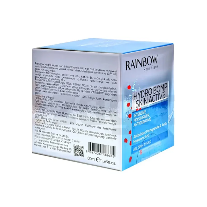 ژل آبرسان رینبو Hydro Bomb دارای ترکیبات اسید هیالورونیک با خاصیت آبرسانی به سلول های پوستی، ضد پیری و ضد چروک بوده و سرعت قابل توجهی در زمینه از بین بردن خشکی پوست و بازگرداندن شادابی پوست دارد. علی رغم بافت سبکی که این واتر ژل دارد؛ تا 24 ساعت آبرسانی پوست را تامین میکند و همین باعث شده است که بسیاری از خانم ها از آن به عنوان زیرساز در آرایش خود استفاده کنند. ژل آبرسان کاسه ای رینبو مدل هیدرو بمب نه تنها باعث مسدود شدن منافذ پوست شما نمیشود بلکه استفاده مداوم و پیوسته از آن پوست شما را در برابر هر نوع خشکی ایمن می سازد. ژل ابرسان کاسه ای رینبو مدل هیدرو بمب از پوست در برابر عوامل بیرونی مانند آلودگی هوا محافظت مینماید.