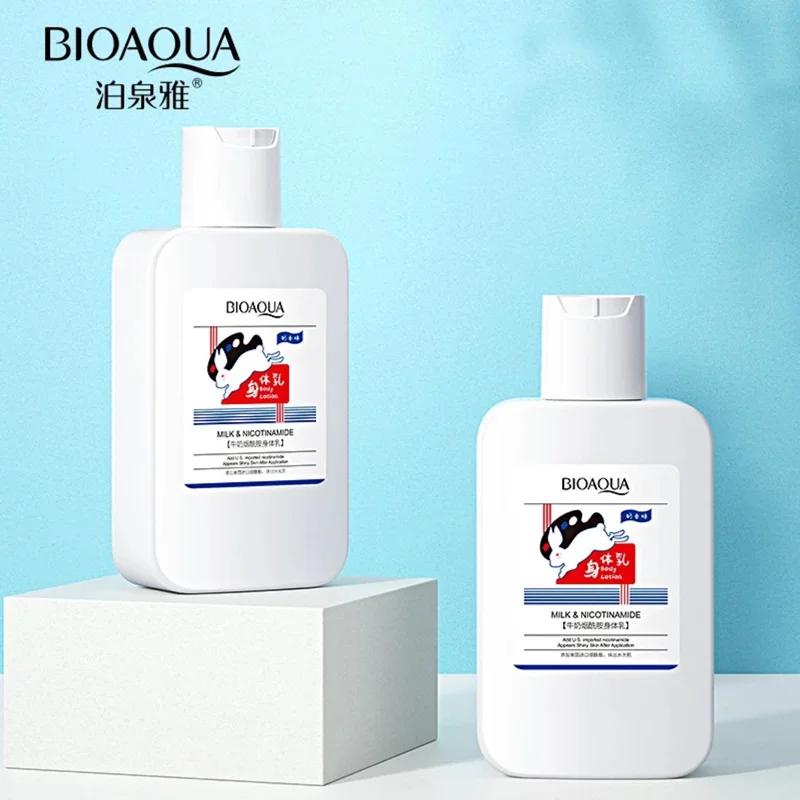 لوسیون بدن روشن کننده شیر و نیکوتین بیوآکوا حاوی عصاره شیر خرگوش و نیکوتین آمید بافتی نرم و سبم با شاین ریزی دارد که بعد از استفاده از آن پوستی نرم و صاف را به شما ارائه میدهد. عصاره شیر با تأمین مواد مغذی مورد نیاز پوست و خاصیت روشن کنندگی بهمراه ترکیب نیکوتین آمید بخوبی پوست را روشن کرده و خشکی و زبری پوست را از بین میبرد.