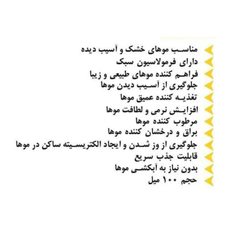این محصول بدون ایجاد چربی و سنگینی، موهایی نرم و ابریشمی برای شما به ارمغان آورده و از این طریق به تسهیل شانه پذیری و حالت پذیری موهایتان کمک میکند. بعد از استحمام مانع گره خوردن و وز شدن موها شده و الکتریسیته ساکن آن را نیز از بین میبرد. همچنین بلافاصله بعد از استفاده، لایه محافظتی بر روی موها ایجاد کرده و برای جلوگیری از آسیب دیدن، ایجاد موخوره و شکنندگی در موها بسیار موثر است.